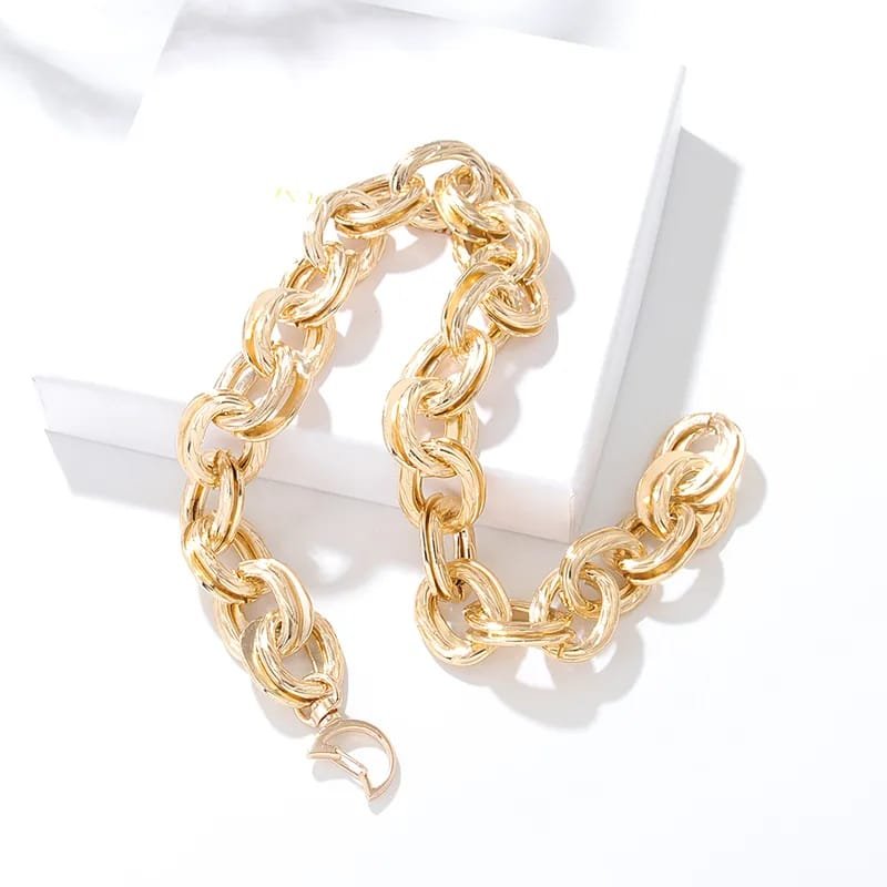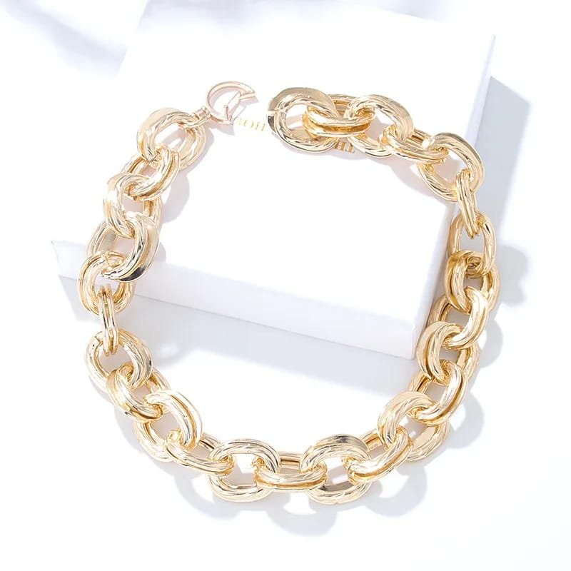 Collar tipo gargantilla con cadena de eslabones dorados, ideal para un look chic, minimalista y Y2K. Fabricado en acero enchapado, es ligero, duradero y perfecto para uso diario. Su brillo propio lo convierte en el accesorio ideal para elevar cualquier outfit con un toque moderno y punk.